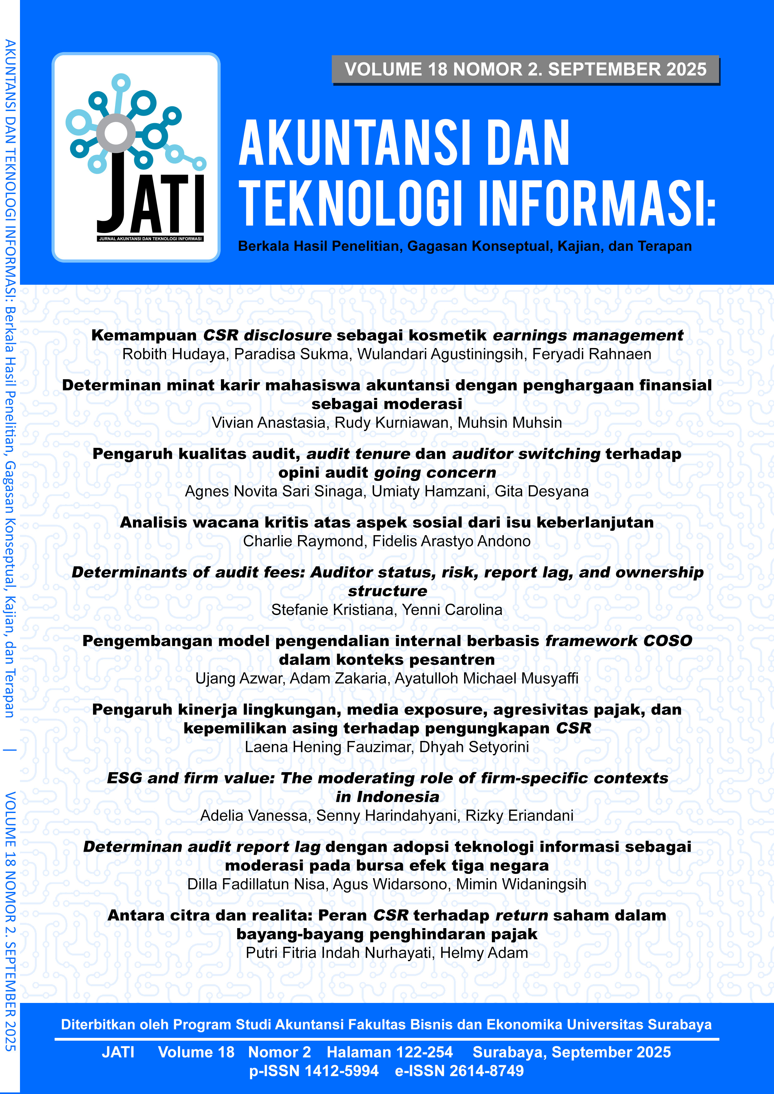 Akuntansi dan Teknologi Informasi (JATI) is an open-access journal with registered numbers p-ISSN 1412-5994 and e-ISSN 2614-8749. Akuntansi dan Teknologi Informasi (JATI) is published by Accounting Department of the University of Surabaya's Faculty of Business and Economics. JATI contains articles on research and studies on accounting science and information technology. JATI is published on 2 (two) periods of March and September.